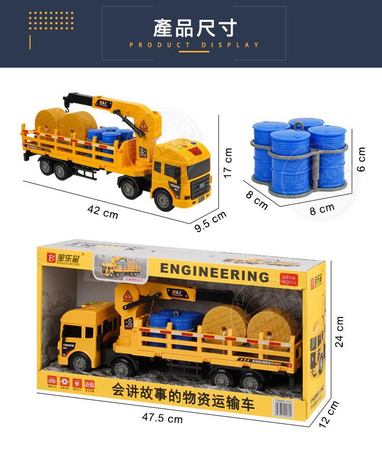 ■ 外盒:47.5*12*24■ 車:42*9.5*17■ 油桶:8*8*6■ 電池另購:4號電池*2以上單位公分;誤差值±1公分■ 樣式總類:共1款(如照片所拍)■ 包裝方式:彩盒包裝■ 商檢證號:M33584 批號:2410305